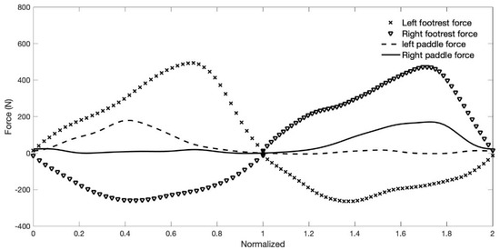 Mean force–time curves of the forces applied on the foot rest/strap and paddle of the kayaker with the worst performance of the sample group. Data was time normalized and represents N = 252 strokes (126 complete stroke cycles).