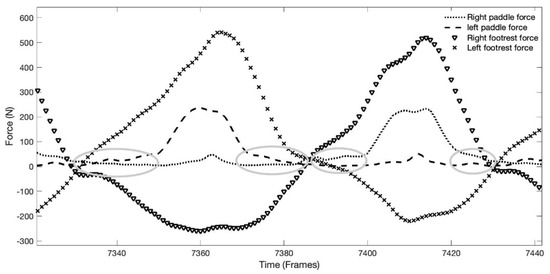 Raw data of the force–time curves of the forces applied on the foot rest/foot strap and paddle, showing the values close to zero before entry and after exit in water no the paddle force curve, identified with grey ellipses.
