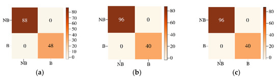 Jasper HSI has 4 different materials with mixing in each pixel. We did not consider the road class because of insufficient data for training. The three considered classes are trees, water, and soil. The Jasper image pixels have been classified into subcategories: Belong (B) and Not Belong (NB) and to three subcategories: Strong Belong (SB), Weak Belong (WB), and Not Belong (NB) to give fixed labels to the groundtruth pixels with fractional abundances. For two labels within the three classes of trees, water, and soil, 2 × 2 confusion matrices are obtained for each of the three classes, and for three labels within the three classes, 3 × 3 confusion matrices are obtained (shown in Figure 15) for each of the three classes. For the two subcategories experiment, we have a total of 136 testing samples, and for the three subcategories experiment, we have a total of 261 testing samples.