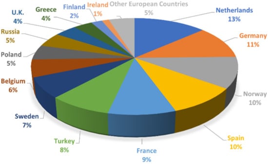 At the European scale, the 5-year outlook reported in Ref. [] considered a growth of 15 GW p.a. as a “realistic expectation”. It should be stated, furthermore, that new installations (as of 2020) of offshore WTs strongly exceeded onshore ones in many North Sea countries (1493 MW vs. 486 MW in the Netherlands, 706 MW vs. 152 MW in Belgium, and 483 MW vs. 115 MW in the UK []); the aggregate onshore and offshore installations are portrayed in Figure 1. This makes economic sense due to the more stable and steady wind flows in the open sea and the lower acoustic and visual impact in comparison to their onshore counterparts. However, with the operation and maintenance (O&M) costs much larger for offshore production facilities, structural health and condition monitoring will be even more important.