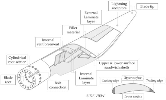 The blade design is actually quite complex, with several different components and materials as pictorially described in Figure 5. This complexity makes them particularly susceptible to manufacturing defects, which indeed were estimated in Ref. [] to account for of all blade damages (with debonding and voids in skin core being the most common defects at 20% and 18%, respectively).