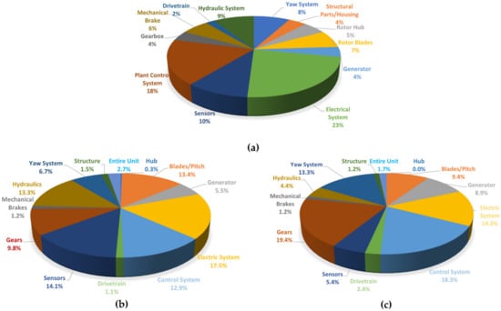 Damage and failure statistics. (a) Percentage of unforeseen malfunctions as recorded in Germany for 1500 wind turbines. Based on data retrieved from Ref. [], collected over 15 years (34,582 events). (b,c) percentage distribution of the total number of failures and downtime for WTs. Based on data retrieved from Ref. [], collected from several sources in Sweden, totalling about 600 WTs from 2000 to 2004 (1202 events, 156,202 h). The nomenclature used in the original sources is reproduced for all charts.