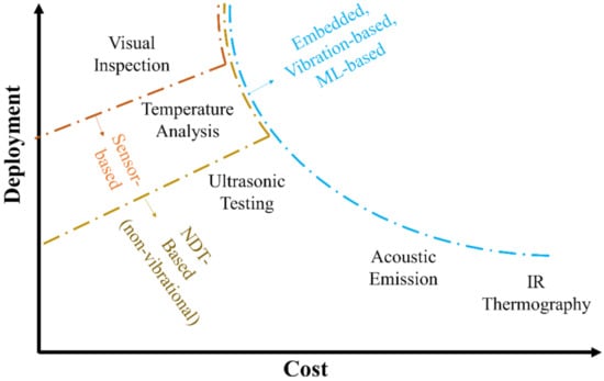 In particular, for mechanical faults, the mean downtime can vary in a range from 6 to 15 days onshore. The cost of a gearbox bearing exchange ranges from EUR 15000 for a simple up-tower replacement to more than EUR 1 million for the substitution of larger (5 MW) gearboxes []. These figures are indicative of onshore installations; as mentioned earlier, failures in offshore WTs would result in even longer interruptions and costlier reparations []. McMillian & Ault [] provided a detailed quantitative analysis of the impact of condition monitoring on O&M costs. In this regard, Figure 2 reports some indicative estimates.