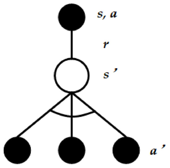 Q-learning [40] is a prevailing reinforcement learning algorithm with the main components of <at,st,rt>, where at, st, rt are the set of the action taken at t, the environmental state at t, and corresponding reward, respectively. The environmental state becomes st+1 after receiving the reward rt. Unlike the model-based algorithm with a priori knowledge of the environment model, the transition probability matrix is not required in the model-free Q-learning [50]. Moreover, this approach is an off-learning type which applies two control strategies for choosing new actions and updating Q value function, respectively. The action choosing policy is exactly the greedy algorithm explained in further detail below. As illustrated in Figure 1, the agent is in the state s and executes the action a with a certain probability according to the ε-greedy method. After that, the agent will get the reward r and upgrade the environment state s into s′. ε-greedy algorithm is exploited to choose the optimal action a′ and update the Q value function as follows: