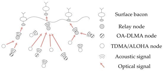 59. Chen, Z.; Wang, J.J.; Wang, X.J.; Xu, L.W. A MAC protocol design for optical-acoustic hybrid underwater wireless sensor network. In Proceedings of the 11th EAI International Conference on Mobile Multimedia Communications (MOBIMEDIA’18), Qingdao, China, 21–23 June 2018; pp. 274–279. [Google Scholar]