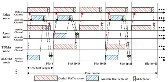The non-agent nodes using the TDMA protocol transmit packets in specific time slots within a frame through a fixed allocation method. The nodes employing the ALOHA protocol are assigned a transmission probability at the fixed sending time [60]. We assume that some non-agent nodes can only send data packets in an optical channel, and others can transfer data packets through an acoustic channel, thus they do not interfere with each other in this way. Similarly, equipped with an acoustical-optical transceiver, each agent node can launch communication with the relay node via an optical channel or an acoustic channel at the same time. Combining with the deep reinforcement learning algorithm, the agents can interact with the environment and take full advantage of the underutilized channels (optical and acoustic channels) after a series of observations and actions. Namely, the agents will capture the available time slots of hybrid optical and acoustic channels no matter which channel is underutilized. Therefore, the network performance can be improved. A fundamental example of slotted operations for a heterogeneous UWSN with two non-agent nodes and one agent node is illustrated in Figure 3.