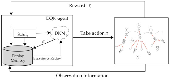 Another key technique for achieving stability in update processes is experience replay, because samples in deep learning are required to be mutually independent and uniformly distributed to each other, while the observations of original Q learning are correlated with each other and do not satisfy this condition. Experience replay [56] helps the training process to achieve stability and break the temporal dependency among the observations, which are employed to train the deep neural network. The key idea of experience replay is to train the agent with the transitions sampled from the buffer of previously experienced transitions [57]. At each time-step t, after the agent interacts with the environment, it stores the corresponding experience tuple et = (at,st,rt,st+1) into the replay memory, where at, st, rt, st+1 are the set of the state input at time t, the action selected at time t, corresponding received reward, and the next state transited from st after taking at at time (t + 1), respectively. The replay memory D consists of multiple experience tuples, i.e., D = {e1,e2,…,eM}, where M is the state history size [58]. At each iteration of DQN, a mini-batch of states, actions, rewards, and next states are sampled from the replay memory as observations to train the Q-network, which approximates the action–value function [53], and DQN adopts the ε-greedy strategy to generate experiences. In addition, the original experience tuple will be deleted as long as the replay memory becomes saturated, and the latest experience tuple will store in the replay memory.