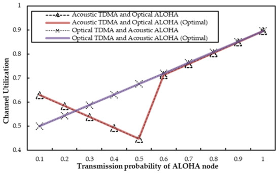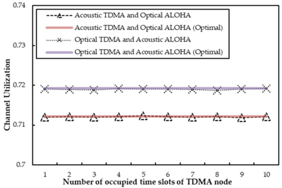 Because both acoustic and optical transmissions exist in one common network model, two types of time slot length are assumed to be the same, which satisfies Equation (5). According to Equations (5) and (6), it is obvious that in each time slot, optical data transmission time is much longer than that of acoustic data transmission. In addition, due to the high optical bit rate, source nodes can transmit more data bits by optical channel during one time slot. In the real traffic case, high-speed transmission of data (such as pictures, videos, etc.) [59] is guaranteed by the optical transmission technique.