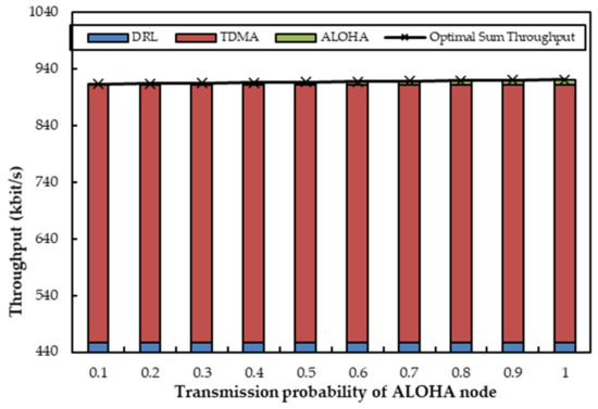 Figure 10. Sum throughput when one agent coexists with one acoustic ALOHA node and one optical TDMA node, which have fixed q and variable R.