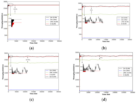 Figure 12. Sum throughput of the network with multiple source nodes using four MAC protocols (i.e., O-DLMA, OA-DLMA, OA-CMAC, and UMC-DLMA). The transmission probability q of ALOHA nodes in (a), (b), (c), and (d) is 0, 0.3, 0.5, and 0.7, respectively.