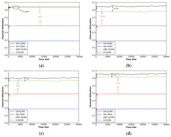 Figure 13. Channel Utilization of the network with multiple source nodes using four MAC protocols (i.e., O-DLMA, OA-DLMA, OA-CMAC, and UMC-DLMA). The transmission probability q of ALOHA nodes in (a), (b), (c), and (d) is 0, 0.3, 0.5, and 0.7, respectively.