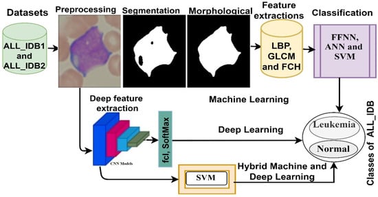 This section presents the techniques, methods, and materials that were used to analyze the ALL_IDB1 and ALL_IDB2 datasets for the early detection of leukemia, as shown in Figure 1. Data were collected from patients with and without leukemia. All the images were improved, and the noise therein was removed. Then, three sets of techniques were used to analyze the improved images: (1) neural networks and machine learning algorithms based on image segmentation and hybrid feature extraction via LBP, GLCM, and FCH; (2) CNN models for extracting deep feature maps and for classifying them on the basis of the transfer learning technique; and (3) hybrid technologies consisting of two blocks each: deep learning and machine learning.