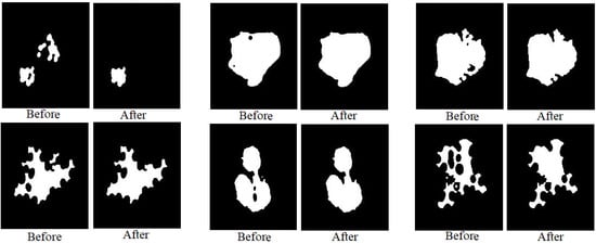 The morphological method is a process for improving segmented images. After the segmentation process, holes not belonging to the ROI are left; these holes lead to a lack of diagnosis [30]. There are many morphological processes that remove these holes, such as opening, erosion, closing, and dilation. Morphological processes create a structure element with a 5 × 5 size, move it to each location of the segmentation image, and compare it with the neighboring pixels. The processes test if the structure element “fits in” with its neighbors or not, and the “hits” process tests the intersection between neighbors. The process continues until the whole image is scanned and an optimized binary image is produced. Figure 5 shows samples of dataset images obtained before and after the application of morphological processes. Where it is noted, the images were improved by filling in the gaps not belonging to the ROI.