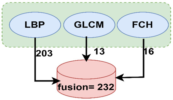 Finally, the features extracted from the three aforementioned methods were merged or fused into one feature vector for each image to obtain highly efficient representative features. The LBP algorithm produces 203 features; the GLCM algorithm, 13; and the FCH algorithm, 16. Thus, when all the features are combined in one vector, the number of representative features becomes 232 for each image. Figure 6 shows the process of fusion of all the features extracted by the LBP, GLCM and FCH algorithms.