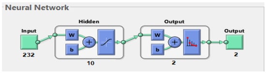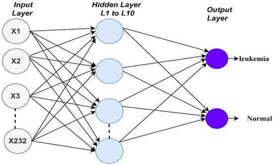 In this work, the ANN algorithm consisted of an input layer containing 232 neurons representing the features extracted from the previous stage. There were 10 hidden layers for handling all the required tasks. Each hidden layer had many neurons interconnected with specific weights. The output layer, which contained two neurons, indicated if the case was a leukemia case or was a normal case. Figure 7 shows the architecture of the ANN algorithm for evaluating the ALL-IDB dataset.