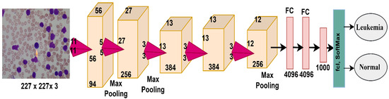 AlexNet is a CNN containing 25 layers divided into many layers from the input of images to the final classification. The most important layers are five convolutional layers, several ReLU layers, three max-pooling layers, two dropout layers, three FCLs, and a softmax layer [37]. AlexNet also contains 650,000 neurons, 62 million parameters, and 630 million connections between neurons. Figure 8 shows the AlexNet architecture and the most critical layers it contains for analyzing the ALL-IDB dataset and classifying the data into two classes: leukemia and normal.