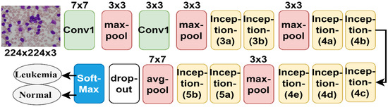 GoogLeNet is a CNN used for pattern recognition and other computer vision applications. It has 27 layers, including pooling layers. The model is characterized by its significant reduction of image dimensions, high computational efficiency, and ability to preserve important information [38]. The convolutional layer contains a filter with a 7 × 7 size, a large size that reduces the image dimensions dramatically as it represents 49 pixels by one pixel. GoogLeNet works to reduce the image dimensions and reduces the image height and width through three max-pooling layers 3 × 3 in size, in addition to one with a 7 × 7-layer size, which significantly reduces the dimensions of the image. The network also produces more than seven million barometers. Figure 9 shows the GoogLeNet architecture for analyzing the ALL-IDB dataset and classifying the data into either leukemia or normal classes.