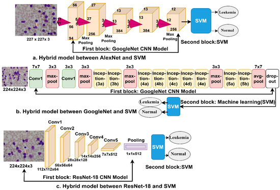 In this section, we present new techniques: hybrid techniques between machine learning and deep learning for evaluating the ALL-IDB dataset for the early detection of leukemia. These hybrid techniques are proposed because the use of deep learning networks poses some challenges, such as the requirement of high-specification computers and the time-consuming process of training the dataset [40]. Thus, the hybrid techniques require medium-specification computers, and the process of training the dataset is fast and not time consuming. In this study, hybrid techniques consisting of two blocks each were used. The first block consisted of the CNN models namely AlexNet, GoogleNet, and ResNet-18, which extract deep features and feed them into the second block. The second block was the SVM classification algorithm, which classifies the deep feature maps extracted from the CNNs. Figure 11a–c show the hybrid architecture consisting of two blocks: deep learning and machine learning (called AlexNet + SVM and GoogleNet + SVM, respectively) and ResNet-18 + SVM. It can be seen in the figure that the FCLs in the CNNs (the first block) have been replaced by the SVM classifier (the second block).