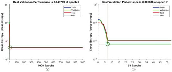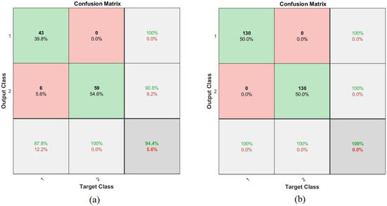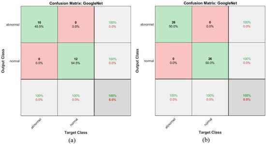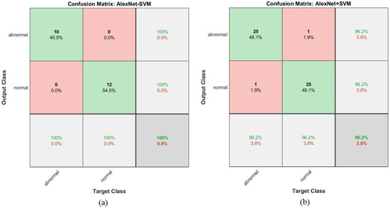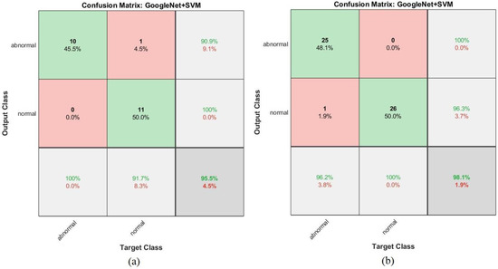 The confusion matrix shown in Figure 27 represents the performance of the GoogLeNet + SVM hybrid network for the early detection of leukemia from the ALL_IDB1 and ALL_IDB2 datasets. Figure 27a shows that the GoogLeNet + SVM network achieved 95.5% overall accuracy, 100% leukemia sample diagnosis accuracy, and 91.7% normal-sample diagnosis accuracy, whereas Figure 27b shows that the same network achieved 98.1% overall accuracy, 96.2% leukemia diagnosis accuracy, and 100% normal-sample diagnosis accuracy for the ALL_IDB2 dataset.