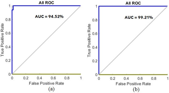 Figure 24 shows the confusion matrix representing the ResNet-18 model for the early detection of leukemia from the ALL_IDB1 and ALL_IDB2 datasets. Figure 24a shows that the ResNet-18 model achieved 100% overall accuracy of each class diagnosis from the ALL_IDB1 dataset, whereas Figure 24b shows that the same model achieved 97.4% overall accuracy, 97.4% leukemia diagnosis accuracy, and 97.4% normal-sample diagnosis accuracy from the ALL_IDB2 dataset.