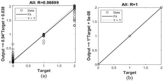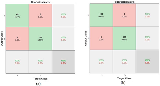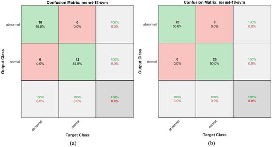 Figure 28 shows the confusion matrix of the ResNet-18 + SVM hybrid technique for the early detection of leukemia from the ALL_IDB1 and ALL_IDB2 datasets. Figure 28a,b show that the ResNet-18 + SVM model achieved 100% overall superior accuracy for each class for both the ALL_IDB1 and ALL_IDB2 datasets.