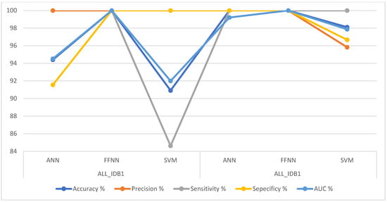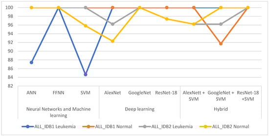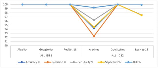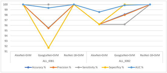 Table 6 shows the performance results of the AlexNet + SVM, GoogleNet + SVM, and ResNet-18 + SVM hybrid techniques. It can be seen that ResNet-18 + SVM achieved better results than the other networks for both the ALL_IDB1 and ALL_IDB2 datasets (100% accuracy, precision, sensitivity, specificity, and AUC). AlexNet + SVM achieved a score of 100% for all the metrics for the ALL_IDB1 dataset, whereas for the ALL_IDB2 dataset, it achieved 96.2% accuracy, 96.2% precision, 96.2% sensitivity, 96.2% specificity, and 98.56% AUC. GoogLeNet + SVM achieved 95.5% accuracy, 95.45% precision, 100% sensitivity, 91.7% specificity, and 99.34% AUC for the ALL_IDB1 dataset and 98.1% accuracy, 98% precision, 96.2% sensitivity, 100% specificity, and 99.87% AUC for the ALL_IDB2 dataset.