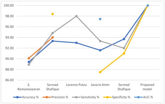 Table 8 summarizes the evaluation results of previous systems compared to the performance of our proposed relevant systems. It is noted that the accuracy reached by the previous systems ranged between 89.40% and 93.7%, while the accuracy of our proposed system reached 100%. As for precision, the previous systems reached 90.10% and 94.01%, while our proposed system reached 100%. Regarding the sensitivity, the previous systems reached between 89.40% and 93.7%, while the sensitivity of our proposed system reached 100%. As for the specificity, the previous systems reached 87.50% and 98.4%, while our proposed system reached 100%. Finally, the previous systems reached an AUC of 83.20% and 97.46%, while our system achieved 100%.