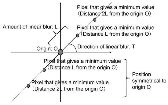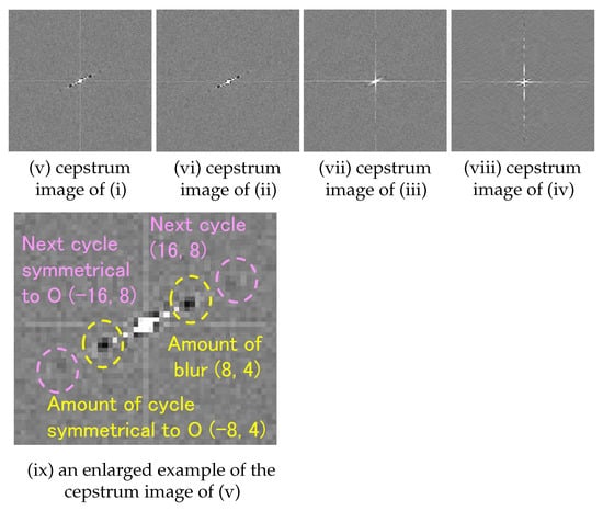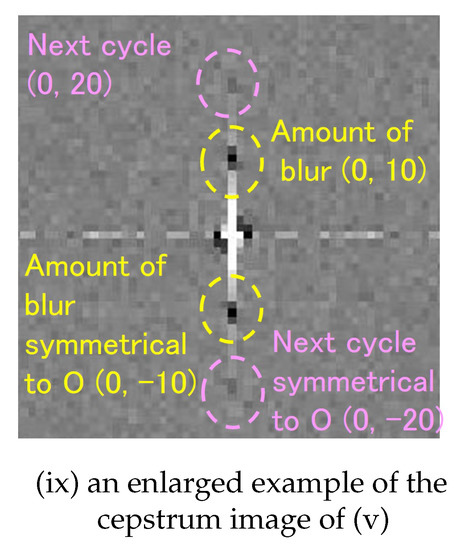 The cepstrum analysis was performed on a total of 16 sub-images shown in Section 3.3. From the results, we checked whether a pixel of minimum appeared at the place corresponding to the blur amount and at the next cycle (the same direction and twice the amount of movement as the blur amount) (hereinafter referred to as “next cycle”). The confirmation was done as follows (Figure 4).
