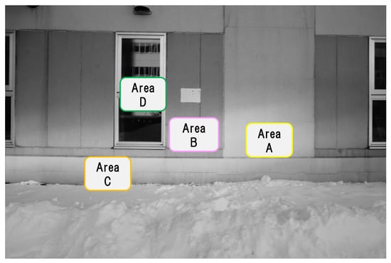 In the original image taken with a fixed camera, small parts of image (121 × 121 pixels) are extracted from 4 areas (A to D) (Figure 2) with different feature points. The size of small parts of image (121 × 121 pixels) is decided as 12 × n (“n” is the amount of blur), described as in Section 3.2. The feature points were checked manually and the areas that we thought appropriate as feature points were extracted. In total 16 images, four images each, are extracted (hereinafter referred to as “sub-image”). Figure 3 shows one of the four sub-images extracted from area A to D respectively. The properties of the sub-images in area A to D are as follows. In the following, the numbers (1 to 4) in lowercase letters of the area names are used to distinguish the 16 sub-images (e.g., the four sub-images extracted from area A are represented by a1, a2, a3, and a4, respectively).