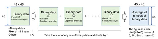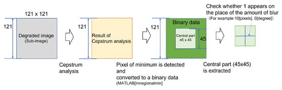 - Extract n (n is an integer) sub-images (45 × 45 pixels) from the com-degraded image and prepare a binary data (1 or 0) of the same size as the cepstrum image (45 × 45) obtained by cepstrum analysis.