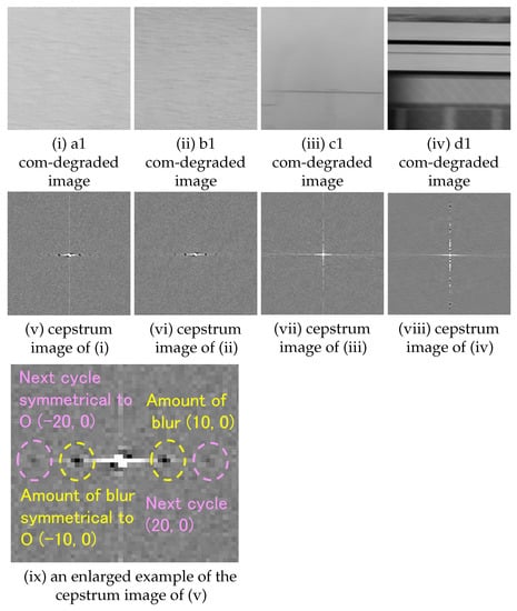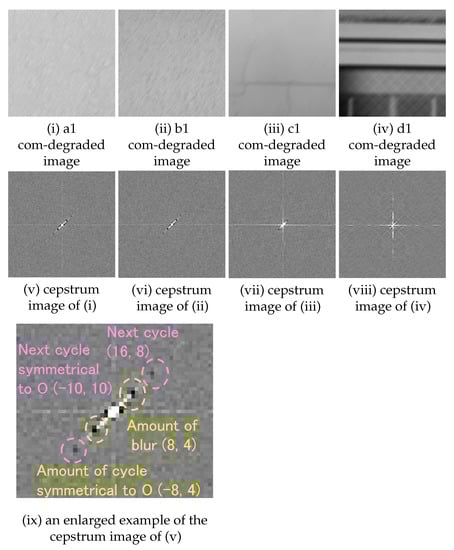 Therefore, referring to Oyamada et al.’s study [], we extracted several different sub-images from the com-degraded image and followed the following procedure to check whether it was possible to reduce the influence of by taking the average of each cepstrum of selected sub-images and narrowing down the number of the pixels of minimum (Figure 9).