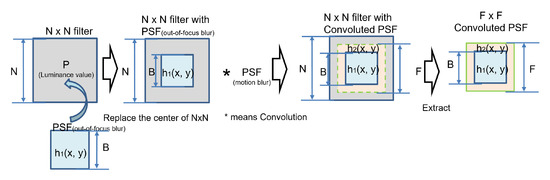 - Estimation of convoluted PSF;The PSF-OOF, , was convolved with the PSF-MB, , movement amount 5, and movement direction 11 (degrees), and the convoluted PSF = which is the cause of the image degradation, was created by the following procedure (Figure 14).