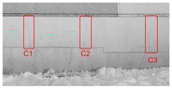 In blurred image (Figure 12), the area in which three cracks images ( to ) (Figure 16: Captured by a fixed camera) observed was extracted as (Figure 17). The same area was detected from each sharpened image, and the crack detection rate (hereinafter represented by “CDR”) (average value of to ) was calculated by MATLAB and compared. The details are as follows.