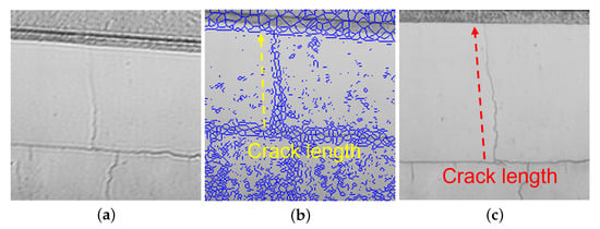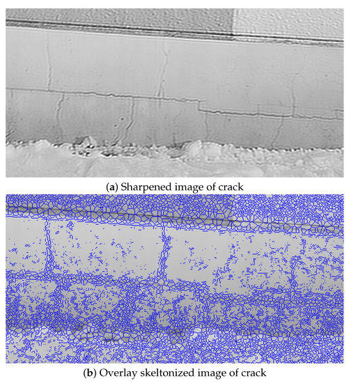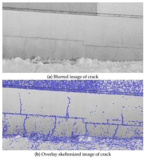 - On the blurred image (Figure 17a) overlay the skeletonized image (Figure 17b), and compare the detected crack length with the crack length of the image acquired by a fixed camera (Figure 17c) to check CDR (crack length in the sharpened image/crack length in the image by a fixed camera). The crack length is defined as the length of a straight line connecting the two ends of a series of cracks in which at least one of the eight neighboring pixels is connected.