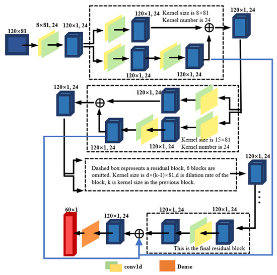 Figure 1 shows the operation of a sample in the TCN structure. A one-dimensional convolution (Conv1d) is performed on the samples of the input layer to obtain a matrix of size (120, 1, 24), which enters the first residual block for the operation (dashed box). The blue is the tensor of the calculation process of the TCN model. The red is the prediction results of TCN, which represents the sea surface temperature in the next 60 months. The input matrix of the residual block is convolved once in one dimension, and the same input matrix is convolved twice in one dimension, and the results are summed and passed to the second residual block, and the results obtained from both convolutions of the residual block are kept until the end for summing. Finally, the prediction result (60, 1) is mapped by the fully connected layer. The TCN model in this study was set up with nine residual blocks.