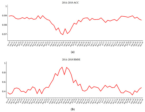 (a) The ACC histogram for each month from 2014 to 2018; (b) the RMSE line chart for each month from 2014 to 2018.