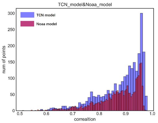 Histogram of the correlation distribution of the TCN and NOAA prediction model for the period from 2014 to 2018.