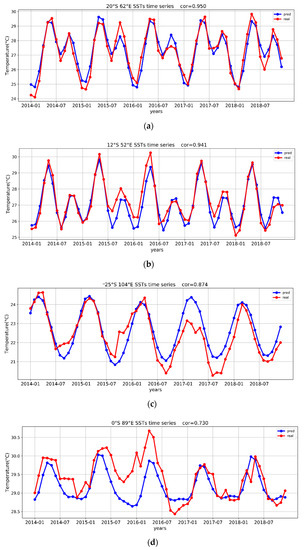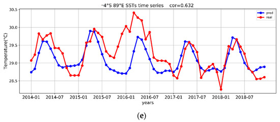 One data point from each of five correlation ranges was randomly selected, and the observed SST series curves and the predicted SST series curves of the five data points are shown in Figure 4. The closer the two curves, the higher the correlation. As shown in Figure 4a,b, the trend of the model-predicted SST series fit well with that of the observed SST series, so the two had a high correlation. The change of temperature data has a periodical feature, but the SSTs of the data points rose abnormally in 2016, observing the red line in Figure 4d,e. In 2015 and 2016, extreme positive IOD events and extreme negative IOD events occurred in the Indian Ocean, respectively. The points of the d and e parts of Figure 4 are located in the eastern region of IOD, so the prediction does not fit the real value well. So, in Figure 4d,e, due to the abnormal SST changes in 2016 at the data points, the deviation of the predicted SSTs from the observed SSTs is high, resulting in a low correlation between these data points. From these five randomly selected points, the temperature variation shows a cyclic change, one cycle per year, but each point is different. Within a cycle, some points have only one peak and trough, and some points have multiple peaks and troughs, and the present model has a good fit for all these points that show different trends. However, the fit is not accurate due to some anomalous changes in some points in some years. In conclusion, it can be seen from the plot of one point that the TCN model is able to basically fit the long-term sea surface temperature variation and is able to learn the periodic variation.