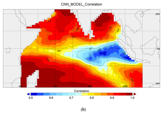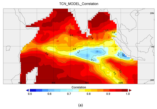 First, in the analysis of TCN, Figure 5a shows the spatial distribution of the correlations of the predictions made by the TCN model. The data points in the correlation range of 55–65% were concentrated at the sea areas between −7° S and −2° S, 75° E and 100° E. The data points located in the middle of the studied waters were in the correlation range of 66–75%. In the low-latitude sea areas from −10° S to −25° S on the east coast of the Indian Ocean, the correlation was low, in the range of 75–85%. The data points in the coastal areas between the Somali Peninsula, the Arabian Peninsula, and the Indian subcontinent, as well as the seas in the west, especially the southwest, had a high correlation (over 85%). Overall, the fit to the SST time series on the Indian Ocean basin was above 75%, with an average correlation of 88.23%, indicating that the proposed model was very robust. According to Figure 5, the correlation degree of the region near the equator decreases. According to Figure 4, the data points d and e near the equator had large errors from June 2015 to June 2016. And the monthly RMSE began to rise from the summer of 2015 and gradually decreased after 2016.