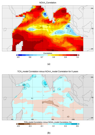 (a) Correlation between the Climate Forecast System version 2 (CFSv2) model-predicted SST time series and the actual SST time series. (b) The correlation of each point of TCN model minus the correlation of the corresponding points of cfsv2.