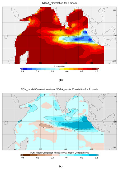 Finally, in order to show the effect of the model more clearly, we collected the results of the first nine months of five years and compared them with the results of a CFSv2 model. From this point of view, we proved once again that TCN has strong long-term prediction ability, as shown in Figure 7a. The average correlation of the CFSv2 model is 89.8%, while that of TCN model is 96.1%, as shown in Table 3. It can be seen from Figure 7c that the correlation degree of the TCN model for most regions is greater than that of CFSv2 model.