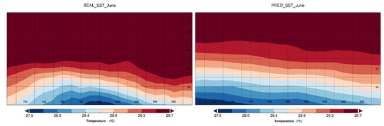 In Figure 8 we have selected the region 70° E–90° E, equator, to 10° S to plot six plots of the real sea surface temperature. The TCN model predicted sea surface temperature for June, September, and December 2015. With the RMSE line graphs, we can see that the model prediction accuracy decreases in the second half of 2015, which affects the average correlation. So, we focus our discussion on the second half of 2015. Our prediction of the gradient of temperature is still accurate, especially in June, as can be seen in the comparison chart (south of the equator, gradually decreasing). The TCN model predicts this change in temperature. The same is true in September. This study focuses on the prediction of correlation, that is, the degree of fit between the true SST variation and the predicted SST variation. This study lays the foundation for large physical ocean phenomena, such as the IOD phenomenon, which manifests itself as the difference between the mean values of temperature in the east and west Indian seas. If we have a high level of correlation prediction of sea surface temperature, it will be of great help for such physical ocean phenomena, such as IOD, which are related to changes in SST.