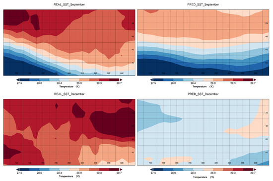 Comparison of regional real and predicted sea surface temperature (70° E–90° E, equator to 10° S) for June, September and December 2015.