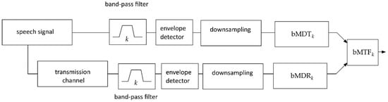 where FFT stands for fast Fourier transform. N is the transform length, and n is the transform coefficient index. Similar to the measurement of the STI signal, we can distinguish the bMDR coefficient for the signal analyzed on the receiving side and bMDT for the signal analyzed on the transmitting side before entering the transmission channel. An additional change is that the bMTF measurement uses a signal composed of actual warning messages to be delivered in a tested space or other signals containing real human speech. The bMTF measure is calculated analogously to the MTF measure: