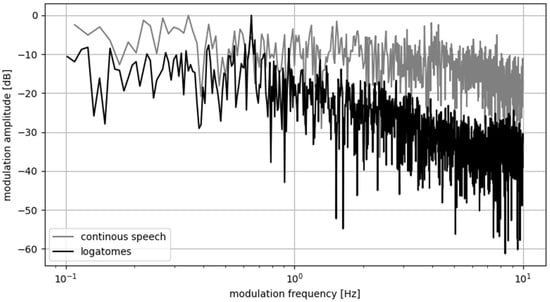Modulation frequency spectra of the signal built from logatomes (the black curve) and a signal generated from the continuous speech (the gray curve). A harmonic component with a frequency of 0.67 Hz is visible for the logatome-based signal, which corresponds to the speech rate of 40 words per second. Modulation envelopes were calculated for the carrier frequency of 1000 Hz.