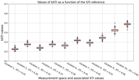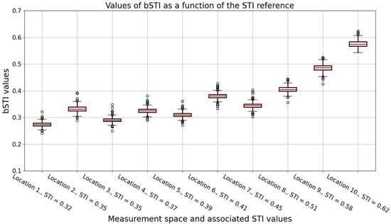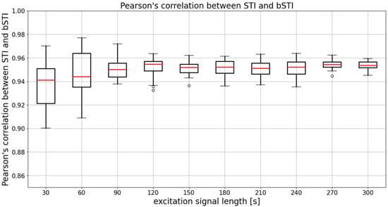 Impulse responses of each location were used to calculate the bSTI measure, starting with convolving a bSTI measurement signal and the excitation and then processing the result of such convolution to obtain the bSTI value. The problem of such a calculation is the choice of a measurement signal length. We decided to test the duration from 30 s up to 300 s with a 30 s increment, which resulted in 10 possible sizes of the excitation signal. Each excitation signal was tested with 20 randomly generated recordings obtained by concatenating Polish native speakers utterances of 4 speakers (2 males and 2 females). Speech signals in such excitation signals did not entirely fill in the desired durations, but the average error of the algorithms was 92 ms, so it was suitable for the measurement of bSTI. It should be noted that speech signal by itself contains much more near-silent moments than the aforementioned 92 ms, which were padded with silence. Such a calculation made it possible to calculate the bSTI measure for each excitation signal processed by each of the 10 impulse responses associated with varying values of STI. A boxplot visualizing the relation between the bSTI measure and the STI is depicted in Figure 3.