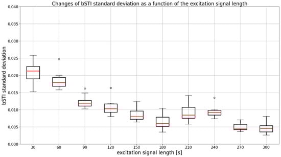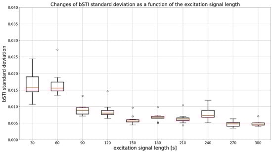 An important factor in measuring the bSTI measure is the choice of the measurement signal duration. Therefore, we decided to investigate how the choice of an excitation signal duration affects the standard deviation of obtained bSTI measurements. As the calculation of bSTI was repeated 20 times for each excitation signal duration, it was possible to prepare a dataset visualized in Figure 3 and Figure 4. Each bSTI value obtained in this process results from a different, random excitation signal consisting of Polish utterances. As there are 10 locations investigated in such a way, the total number of bSTI values calculated in this process is 2000. A standard deviation is derived based on the results of bSTI values obtained for each of the 10 sites.