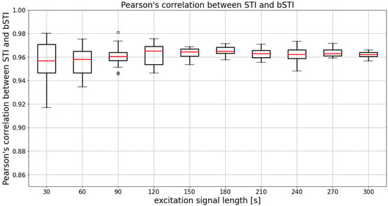 Another way of evaluating the bSTI measurement method is the evaluation of the linear relationship between the STI measurement (performed on-site, during the impulse response acquisition) and the series of bSTI values calculated with the use of 20 randomly generated excitation signals (20 signals for each duration). Pearson’s correlation coefficient can be calculated for the reference STI values of 10 impulse responses and associated bSTI values. This calculation can be repeated 20 times as each random bSTI measurement was also generated 20 times. Results of such analyses are shown in Figure 5.