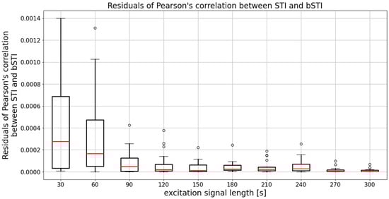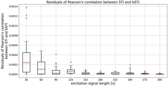 The mean (averaged across all excitation signal durations) median Pearson’s correlation factor is 0.961. This means that the degree of correlation between STI and bSTI is high, and bSTI can be a good measure derived from the STI and can be used in similar situations as the STI. However, as can be seen in Figure 5, the choice of the excitation signal duration determines the level of variance of obtained results. The median is similar in each case, and this fact is also confirmed by statistical analysis. The Levene test in the case of data from Figure 5 yielded the test statistic of 11.02, which results in a p-value lesser than 0.001. This means that variances of the data are not equal. Next, the Kruskal–Wallis test resulted in a test statistic of 14.61, which results in a p-value of 0.10. This leads to the conclusion that there are no statistically significant differences between medians of data presented in Figure 5. Therefore, the initial observation that the main difference between groups is defined by variance and not the medians is correct. To further test the variances of data from Figure 5, residuals of Pearson’s correlation coefficient were calculated in the following manner: