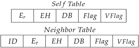 Each node in the network has five main attributes: residual energy , energy harvesting rate , data buffer occupancy , the mark of whether the buffer can receive data and the mark of whether the node is void node . In addition, each node maintains two tables containing the above attributes: Self Table and Neighbor Table.
